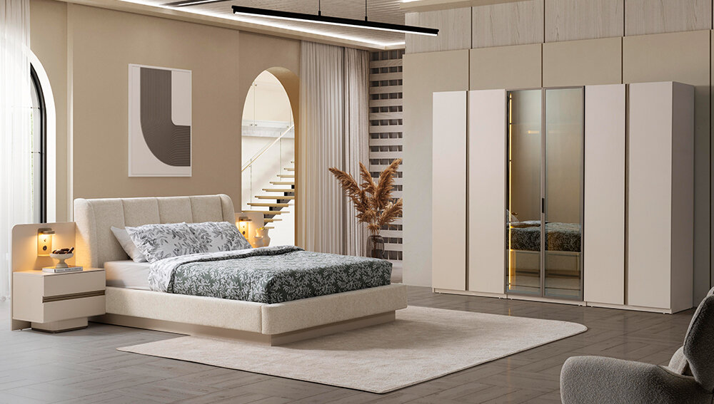 Kumsal Plus 6 Kapaklı Dolap, Kumsal Plus Şifonyer, Kumsal Plus Bazalı Karyola, Kumsal Plus Komodin 2 adet, Puf |