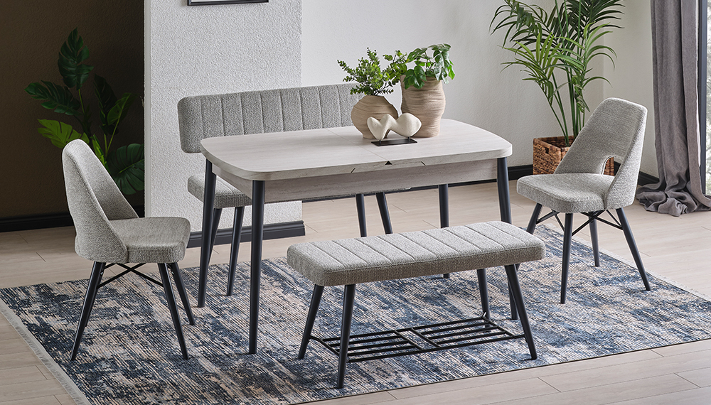 1 Adet 75*130 Kelebek Masa 1 Adet 100'lük Kanepe 1 Adet 100'lük Bench 2 Adet Kafesli Efe Sandalye |